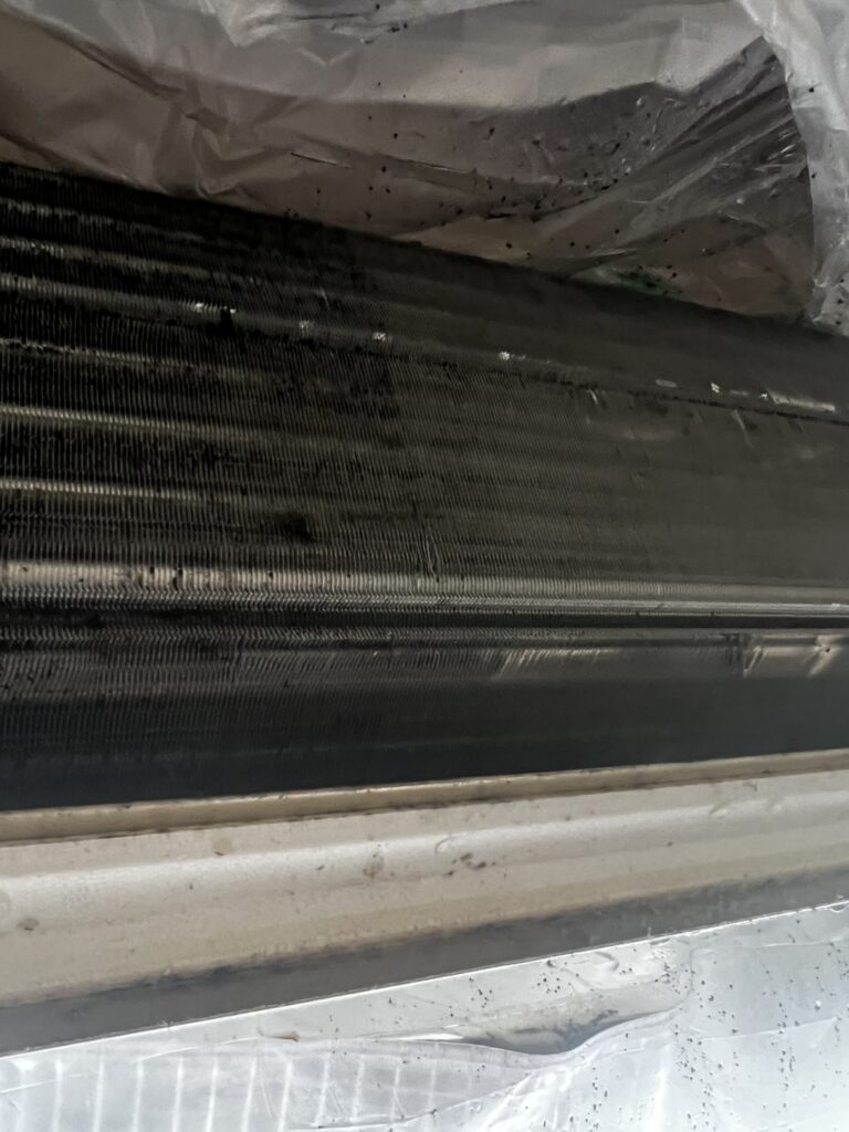 手前半分が未洗浄、冷房使用前、暖房使用に切替前に洗浄しておくと、清潔で省エネ効果も発揮です。